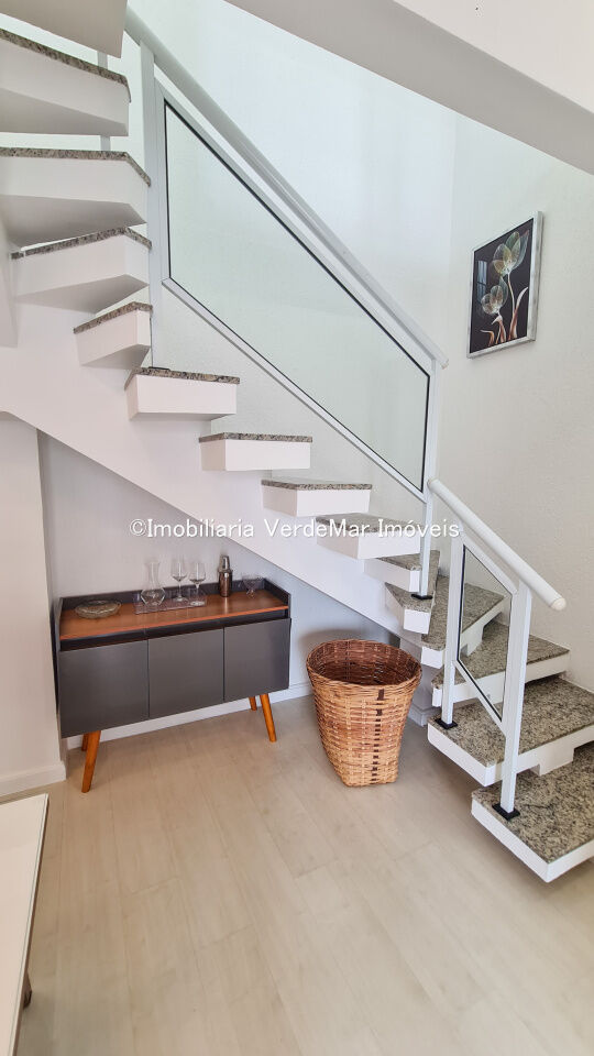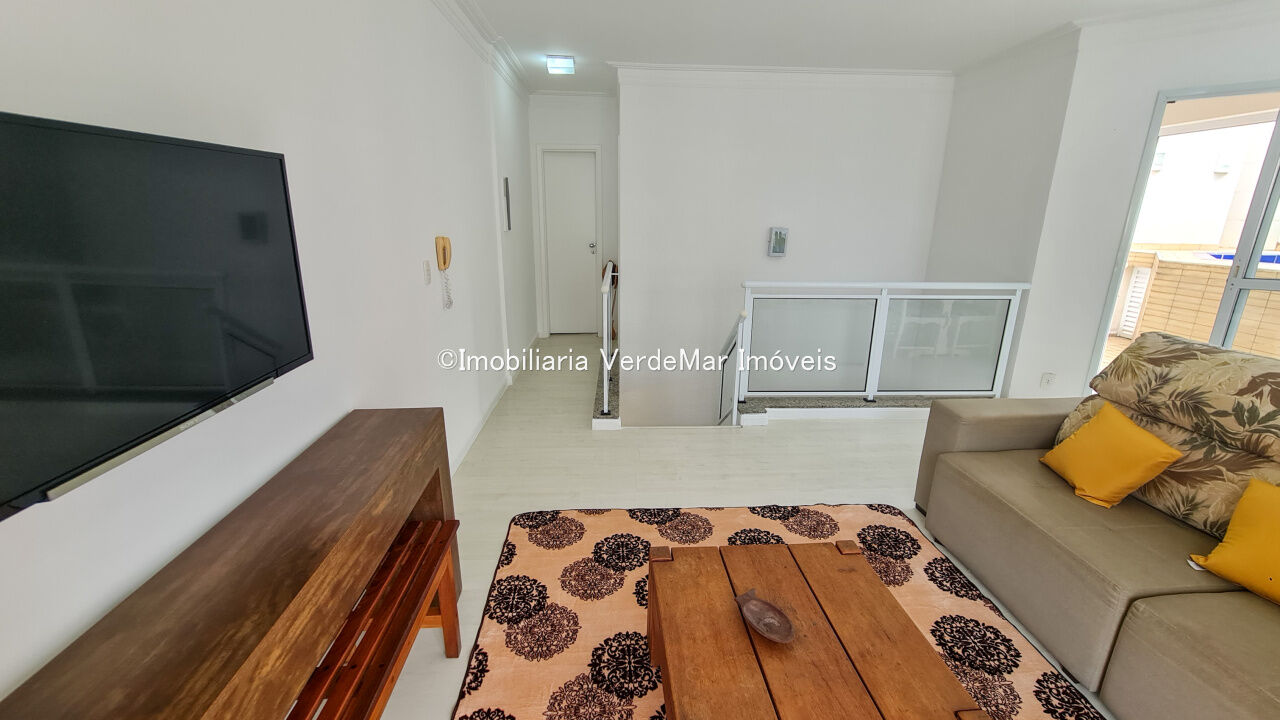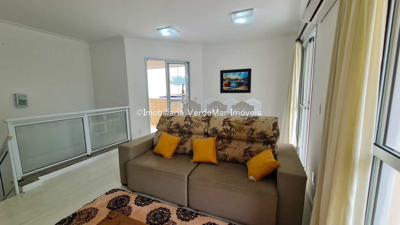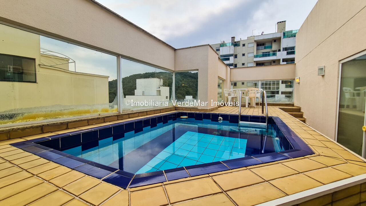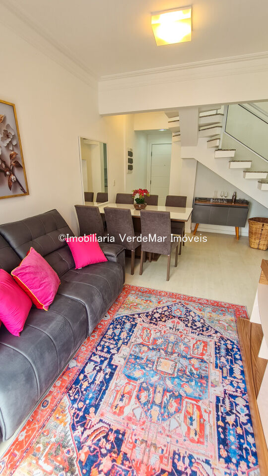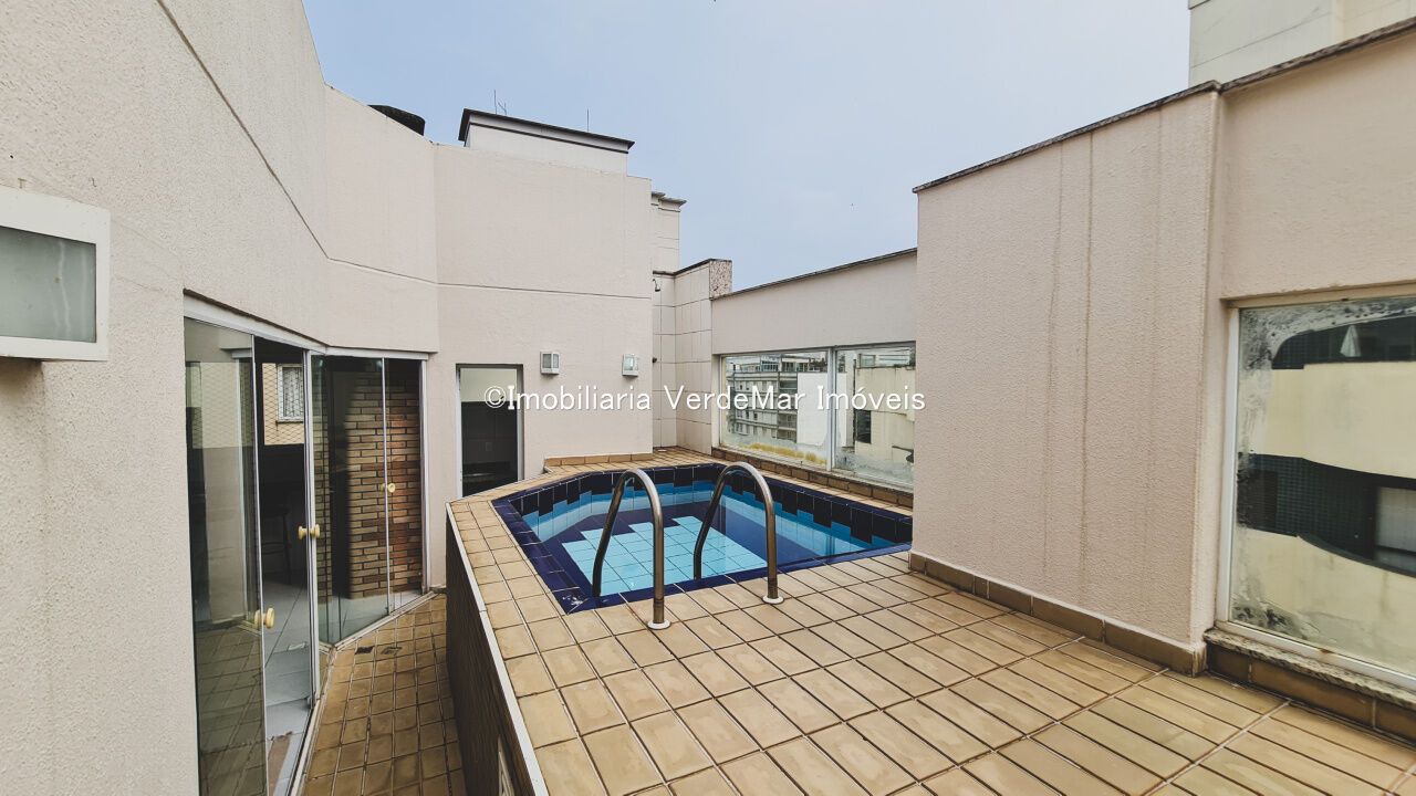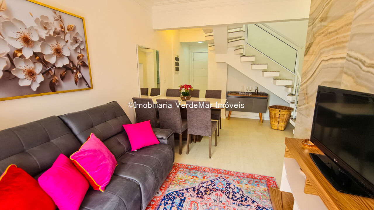 Cobertura Duplex à venda na praia das Pitangueiras em Guarujá, com 3 dormitórios sendo 1 suíte, sala 2 ambientes com sacada no piso inferior e salas de tv e jantar no piso superior, banheiro social, cozinha planejada e lavanderia. No terraço, espaço gourmet com churrasqueira, piscina e banheiro.