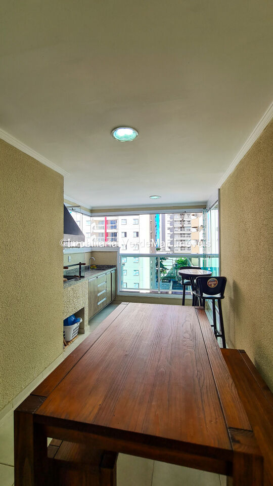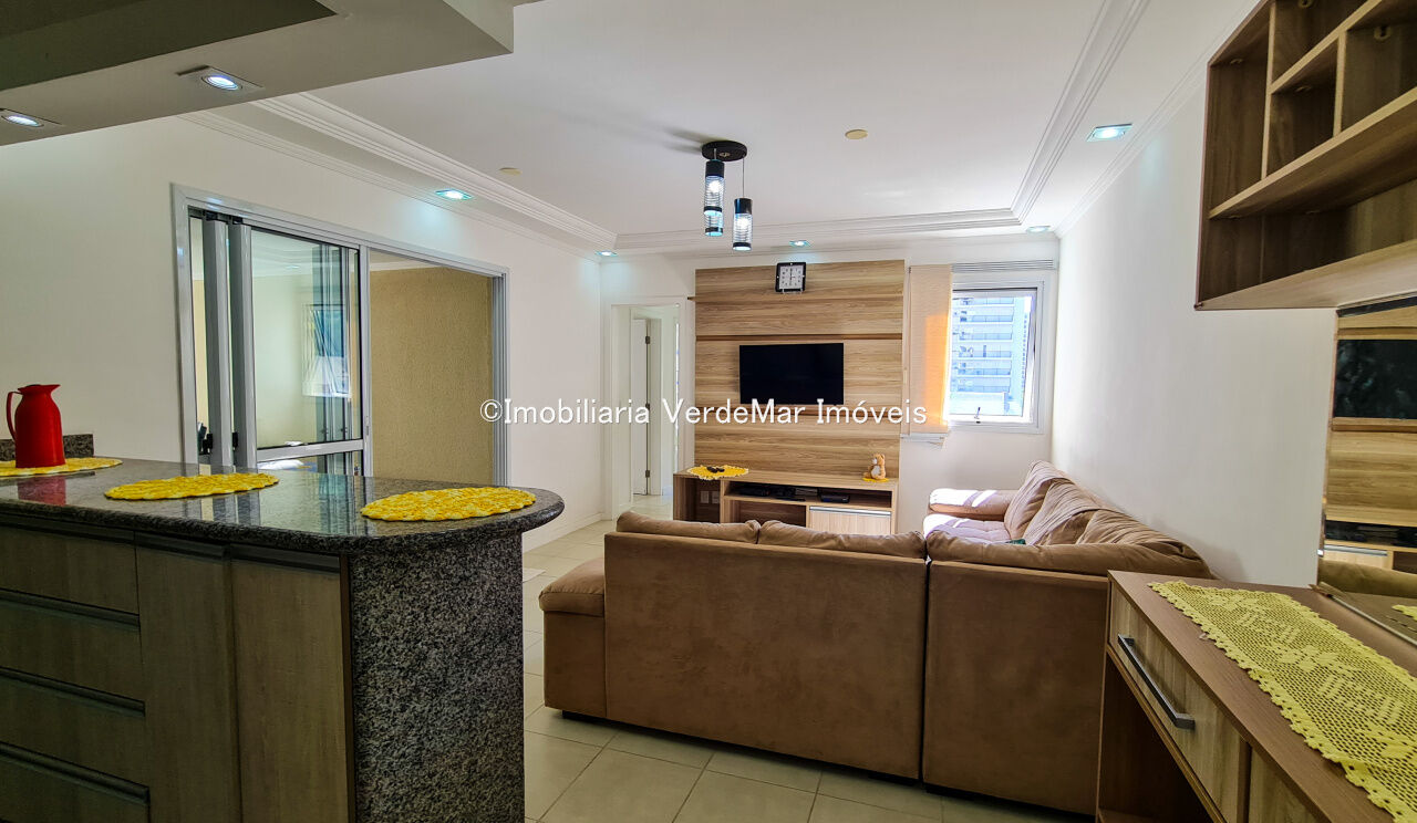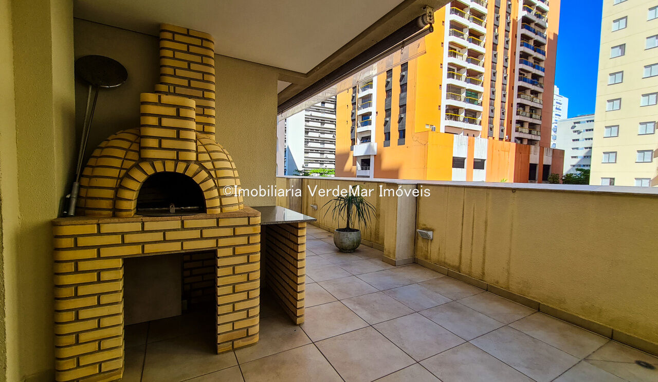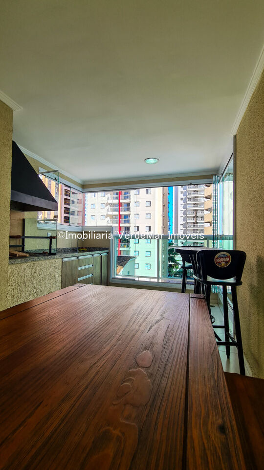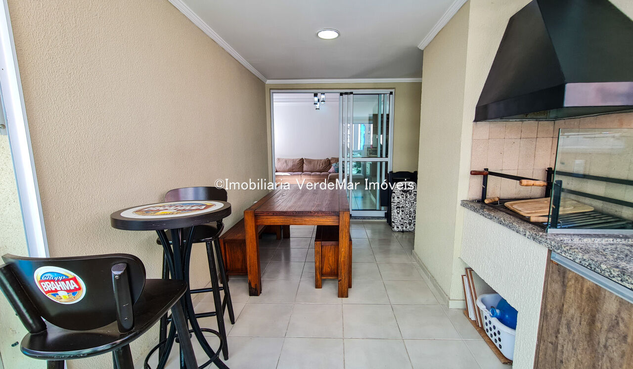 Apartamento com varanda gourmet à venda na praia das Pitangueiras em Guarujá, com 03 dormitórios sendo 01 suíte, sala de estar integrada com a varanda gourmet, banheiro social, cozinha planejada estilo americana e lavanderia.