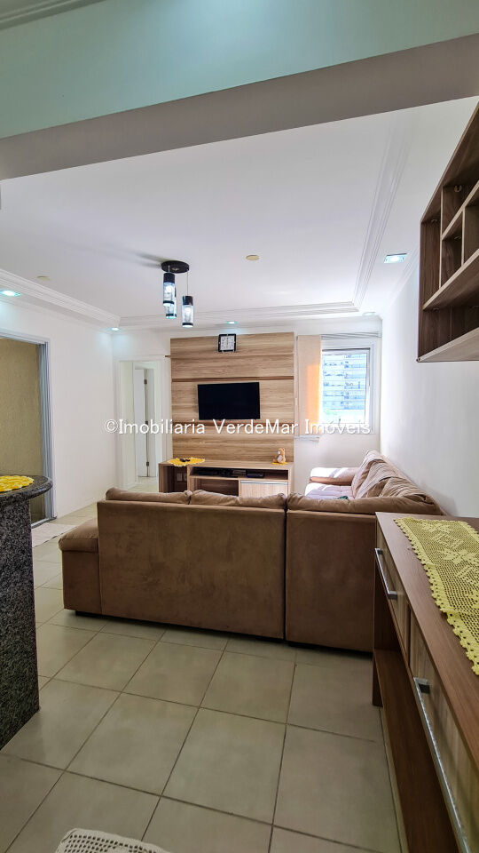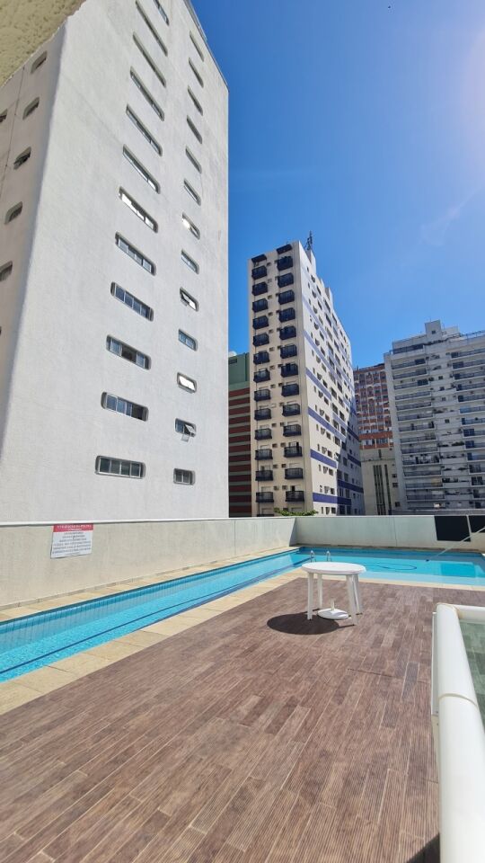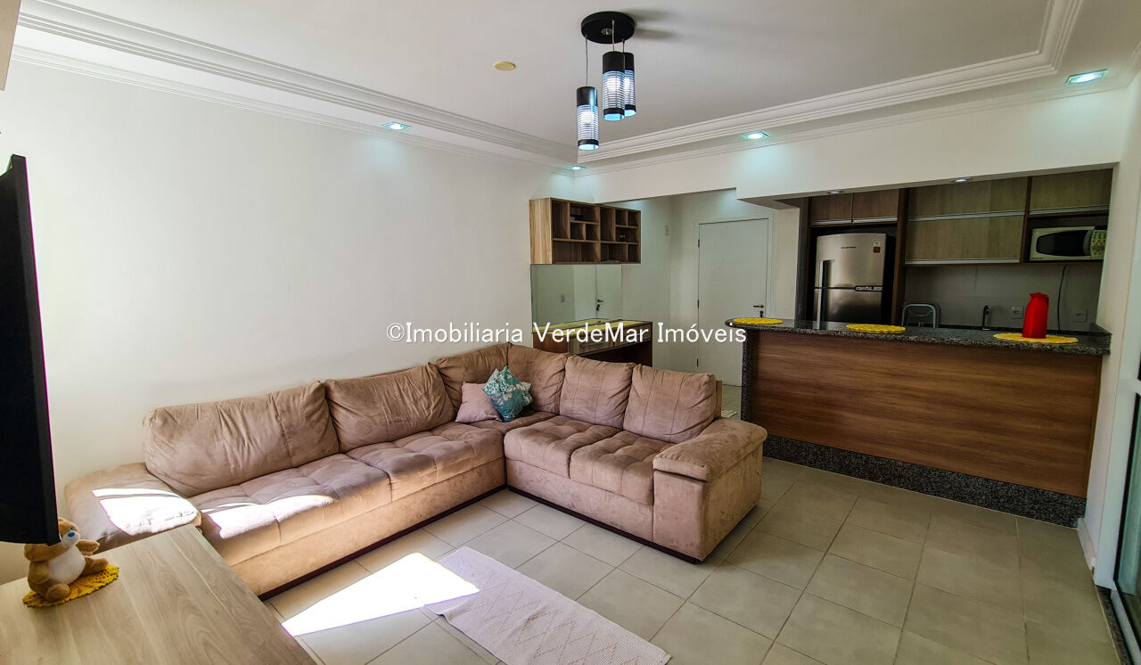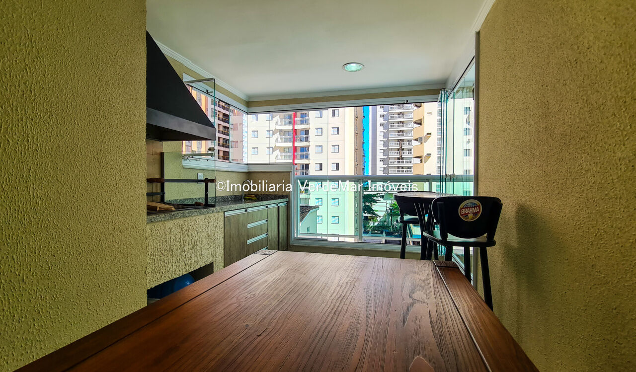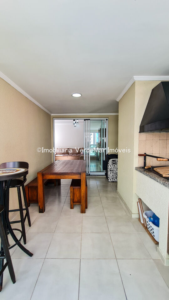 Apartamento com varanda gourmet à venda na praia das Pitangueiras em Guarujá, com 03 dormitórios sendo 01 suíte, sala de estar integrada com a varanda gourmet, banheiro social, cozinha planejada estilo americana e lavanderia.