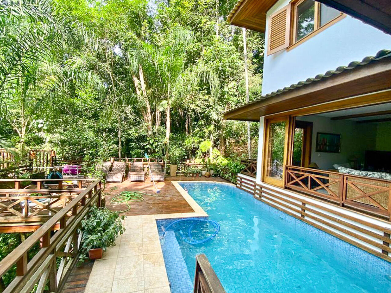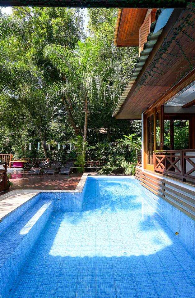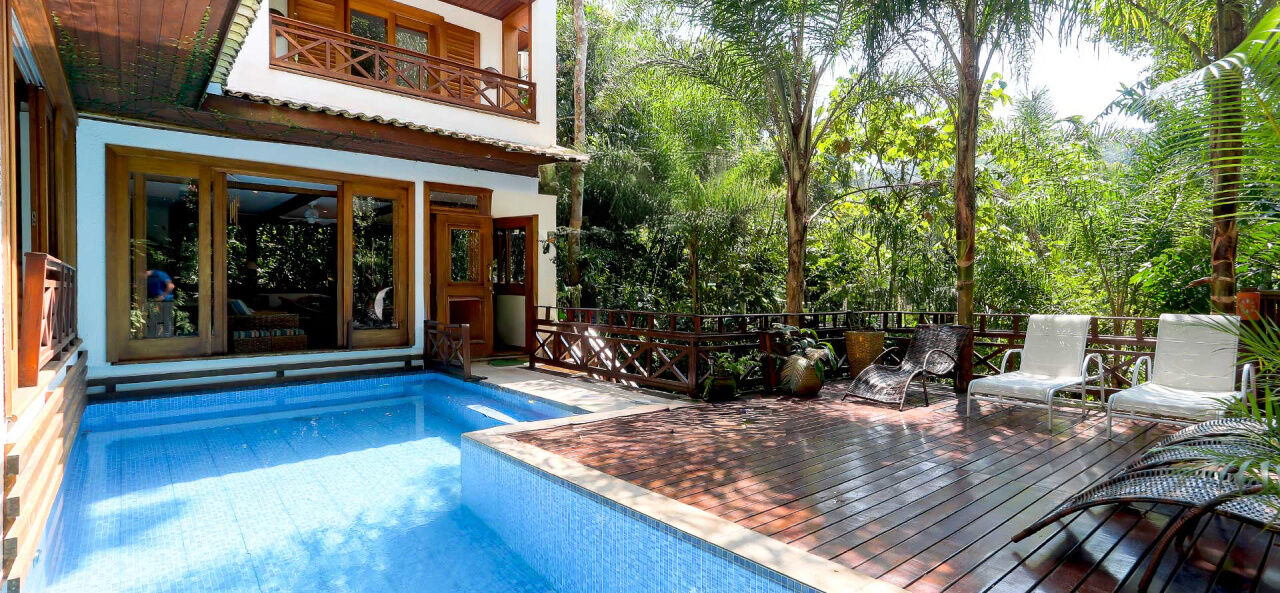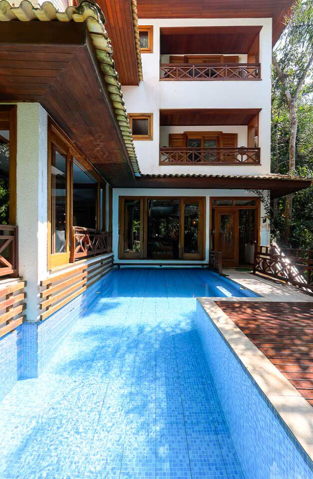 Lazer da casa com piscina, jardim, espaço gourmet com churrasqueira.