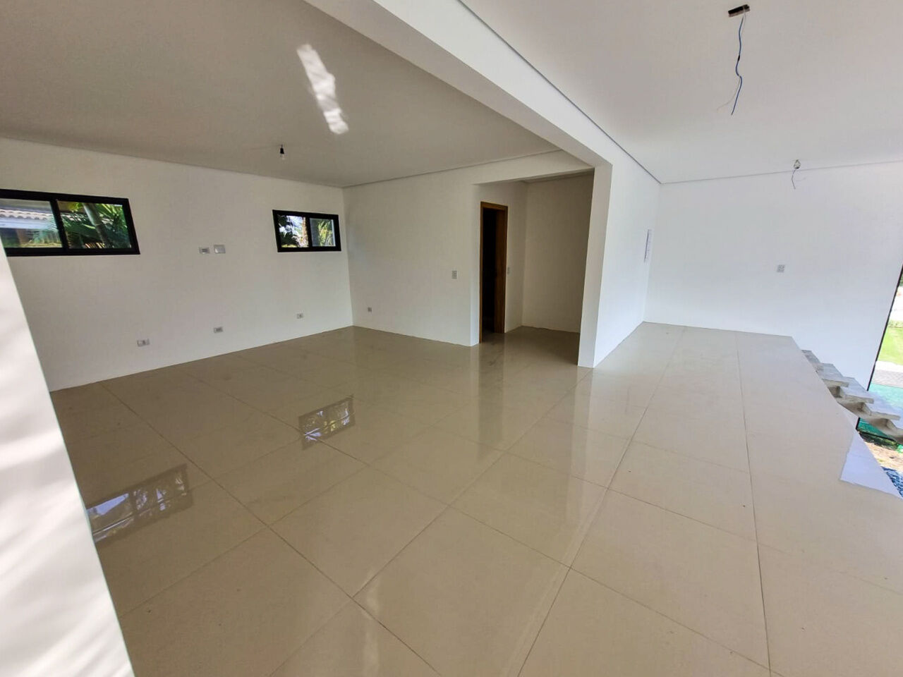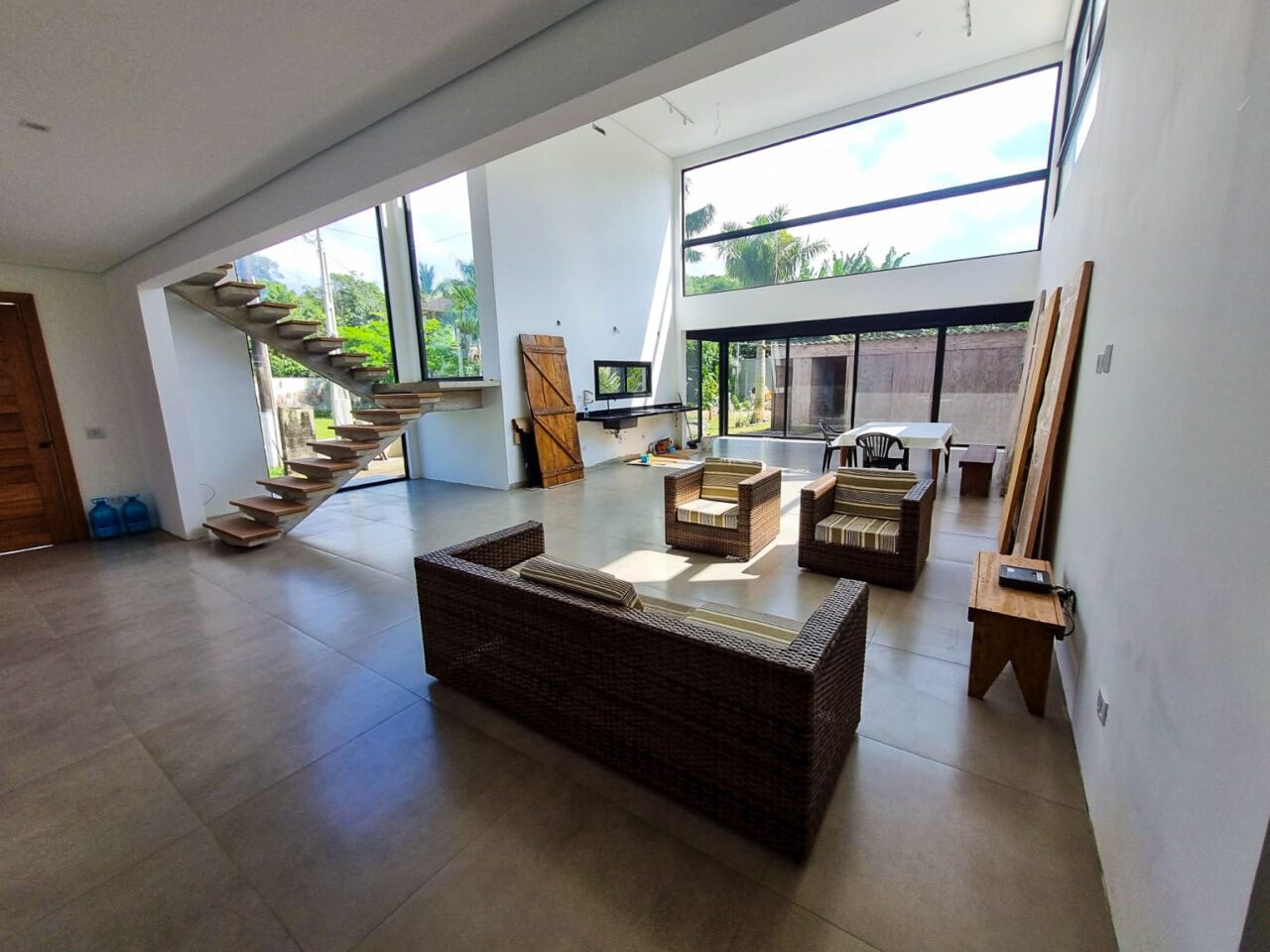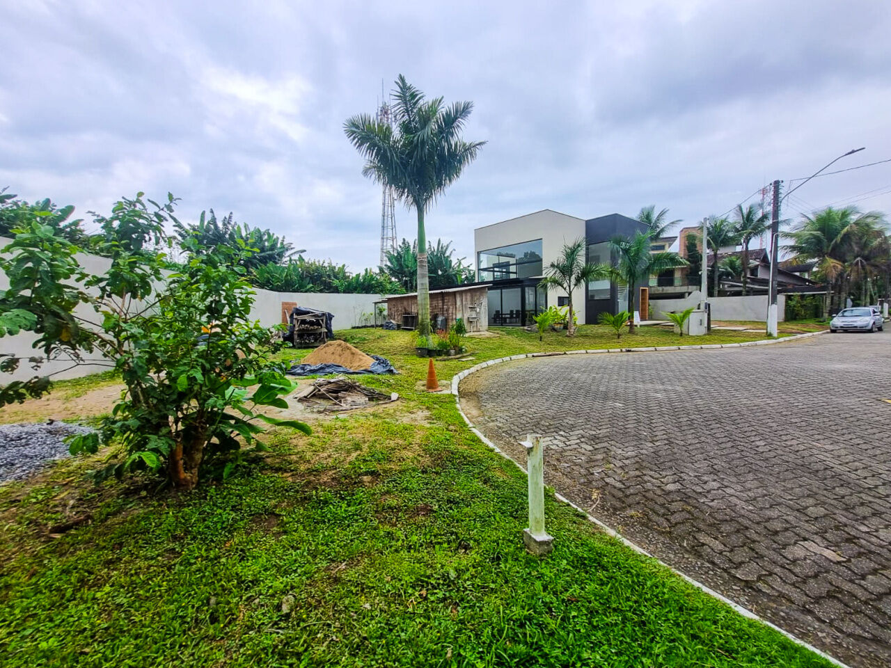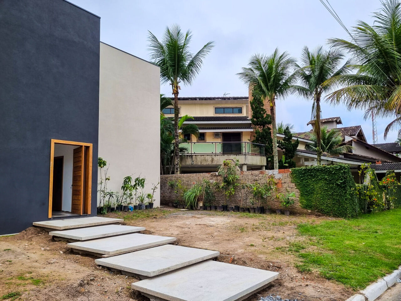 Condomínio Park Lane na Praia de Pernambuco em Guarujá, casa nova à venda com 04 suítes, sala para 02 ambientes com mezanino, lavabo, cozinha planejada, e área de serviço.