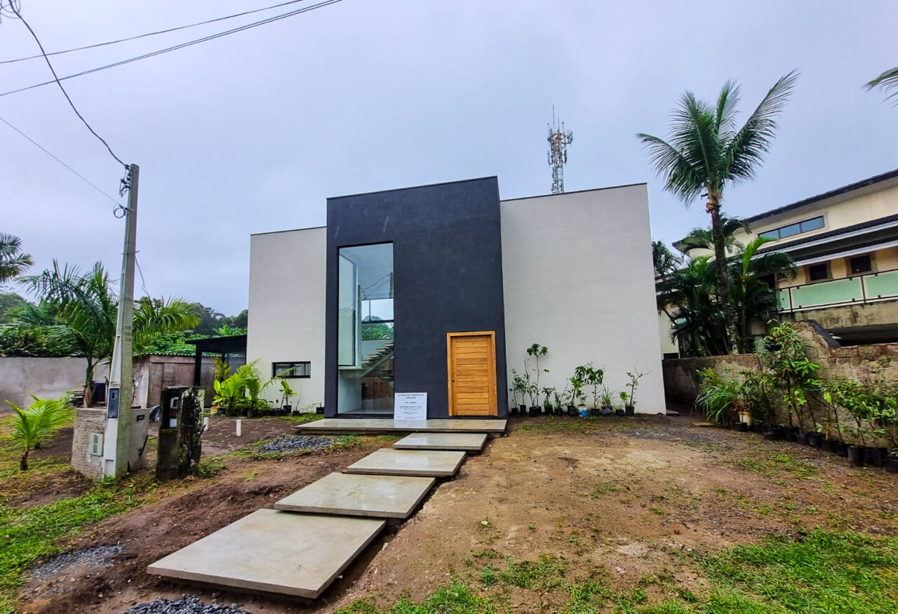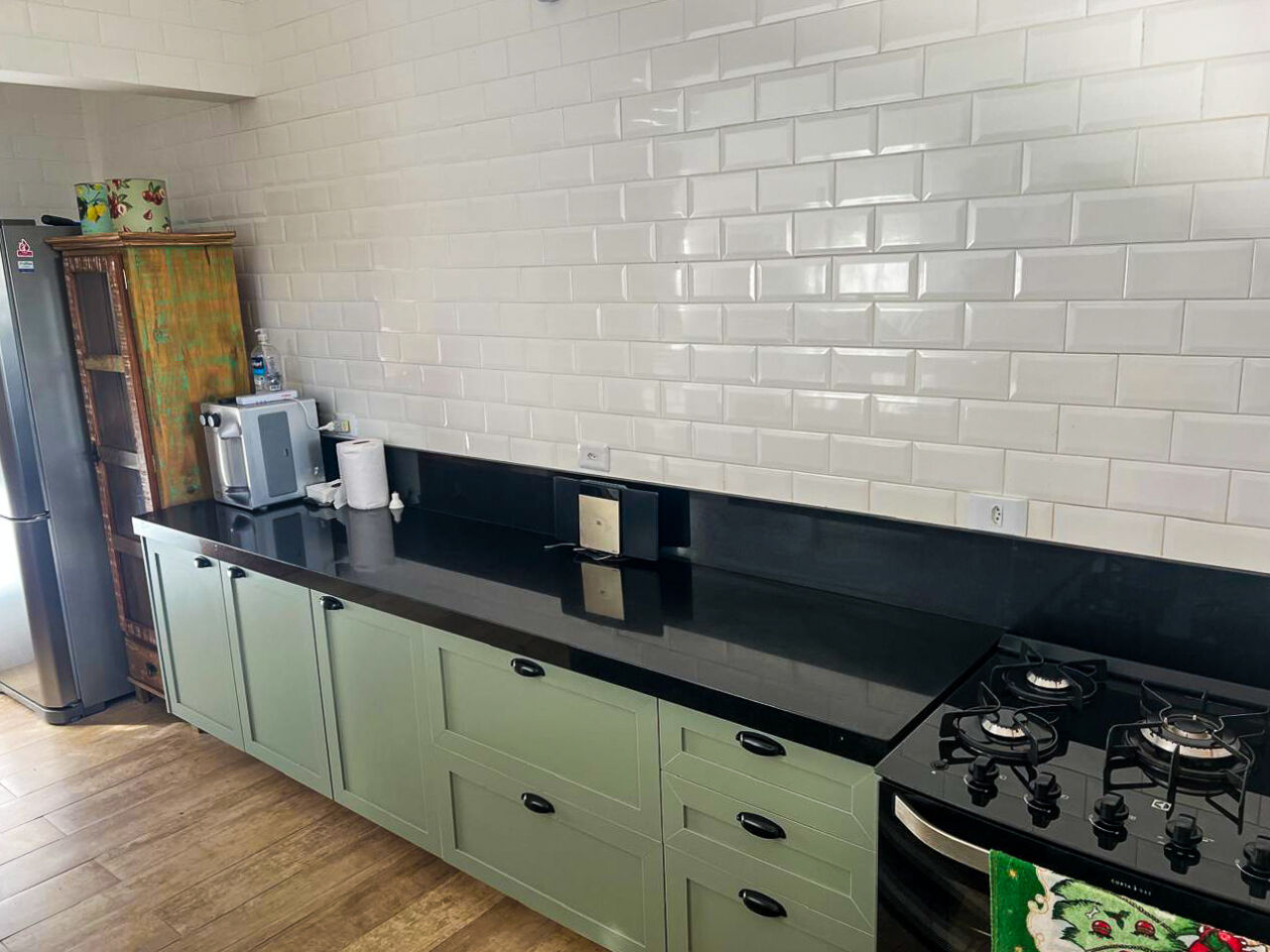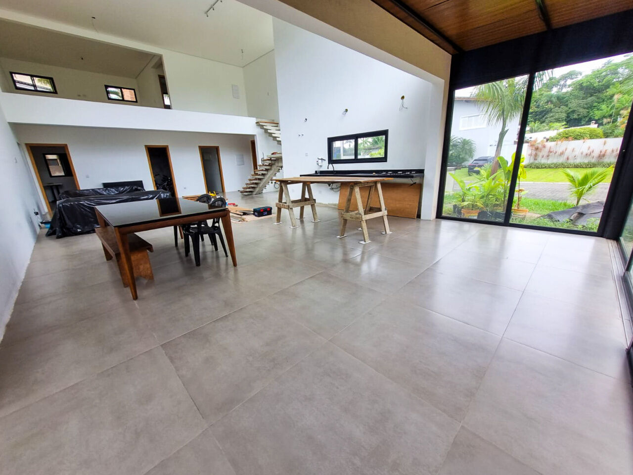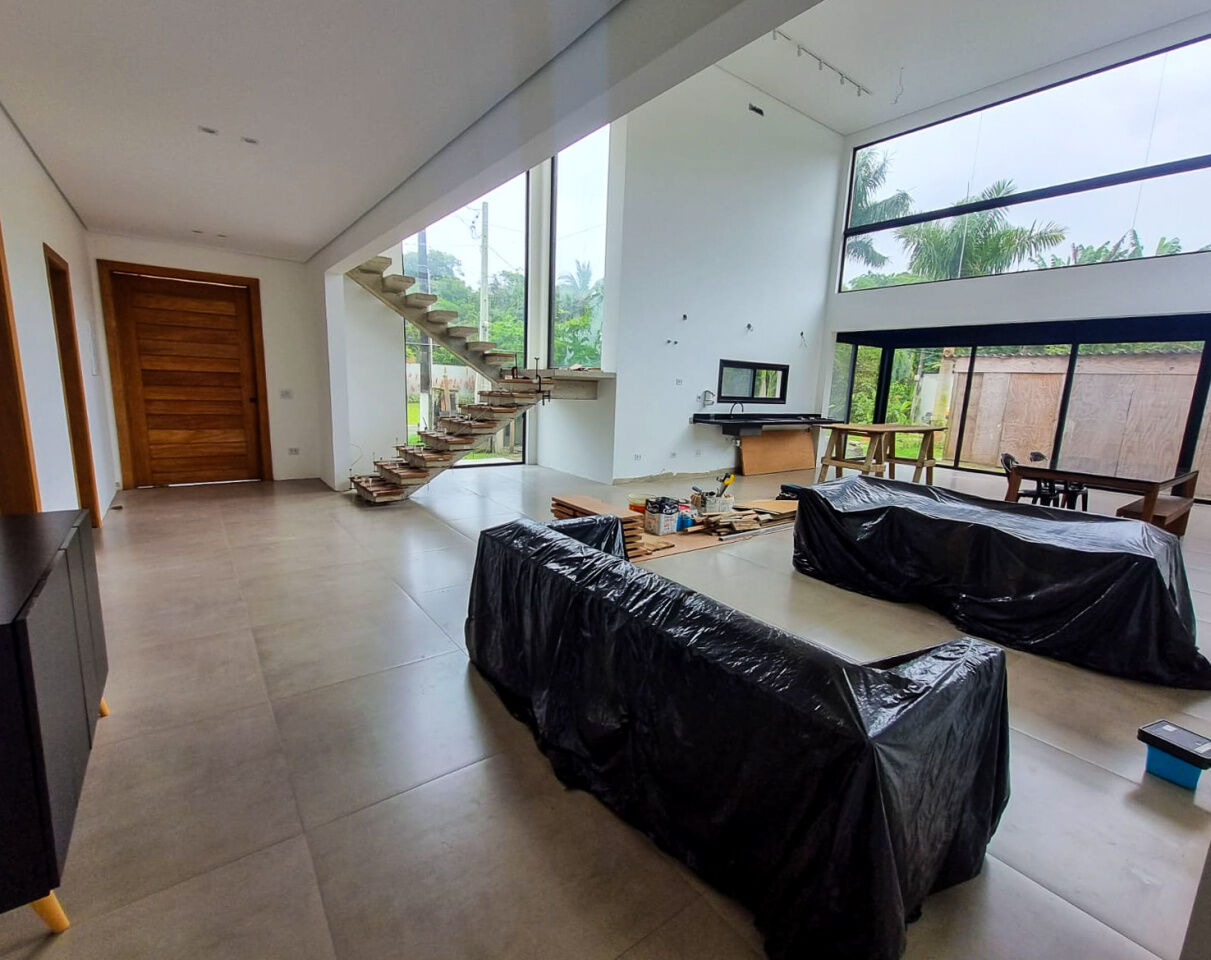 Condomínio Park Lane na Praia de Pernambuco em Guarujá, casa nova à venda com 04 suítes, sala para 02 ambientes com mezanino, lavabo, cozinha planejada, e área de serviço.